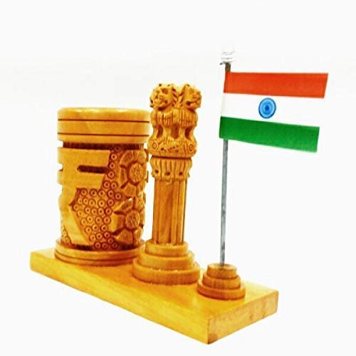 Peacock Art Wooden Pen Stand with Ashok Stambh Emblem & National Flag Rupee Design Desk Organiser for Ofiice Study Table