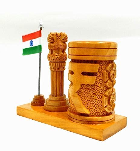 1. Peacock Art Wooden Pen Stand with Ashok Stambh Emblem & National Flag Rupee Design Desk Organiser for Ofiice Study Table