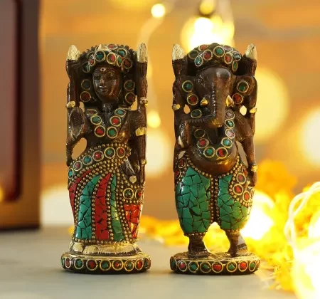 Carved from resin, inlaid with colorful stones, the God & Goddess of prosperity shall bless your abode in their most enchanting form with the Stone Work Laxmi Ganesha in Gift Box. Perfect token of auspiciousness for your altar, locker, display shelf, or puja room. Great gift for festive occasions!