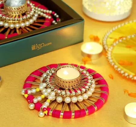 Centerpiece for Christmas decor, this gorgeous Tea-light Candle has elegant pearl beads work along with traditional Rajasthani Gota work on the platter. The golden zari work on a pink rim makes it undeniably stunning. Unique & beautiful, this will surely enhance one’s New Year decor style.